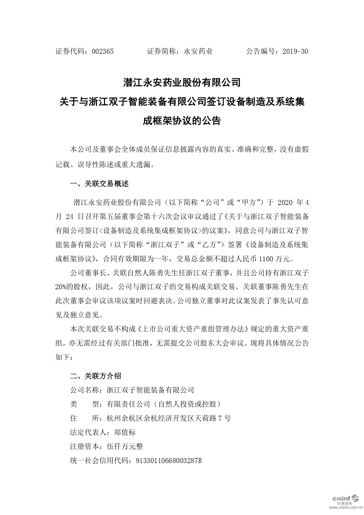关于与浙江双子智能装备有限公司签订设备制造及系统集成框架协议的公告