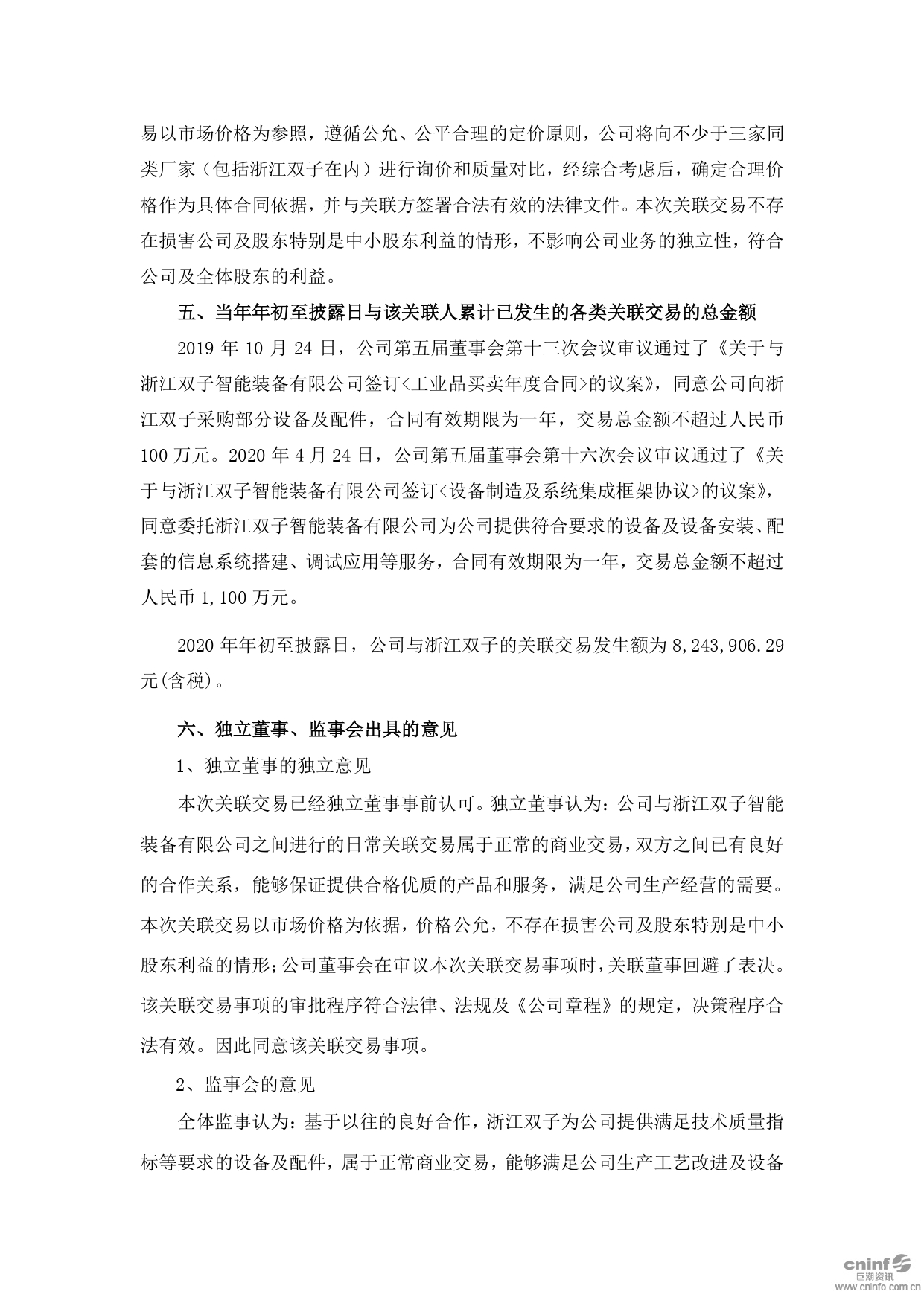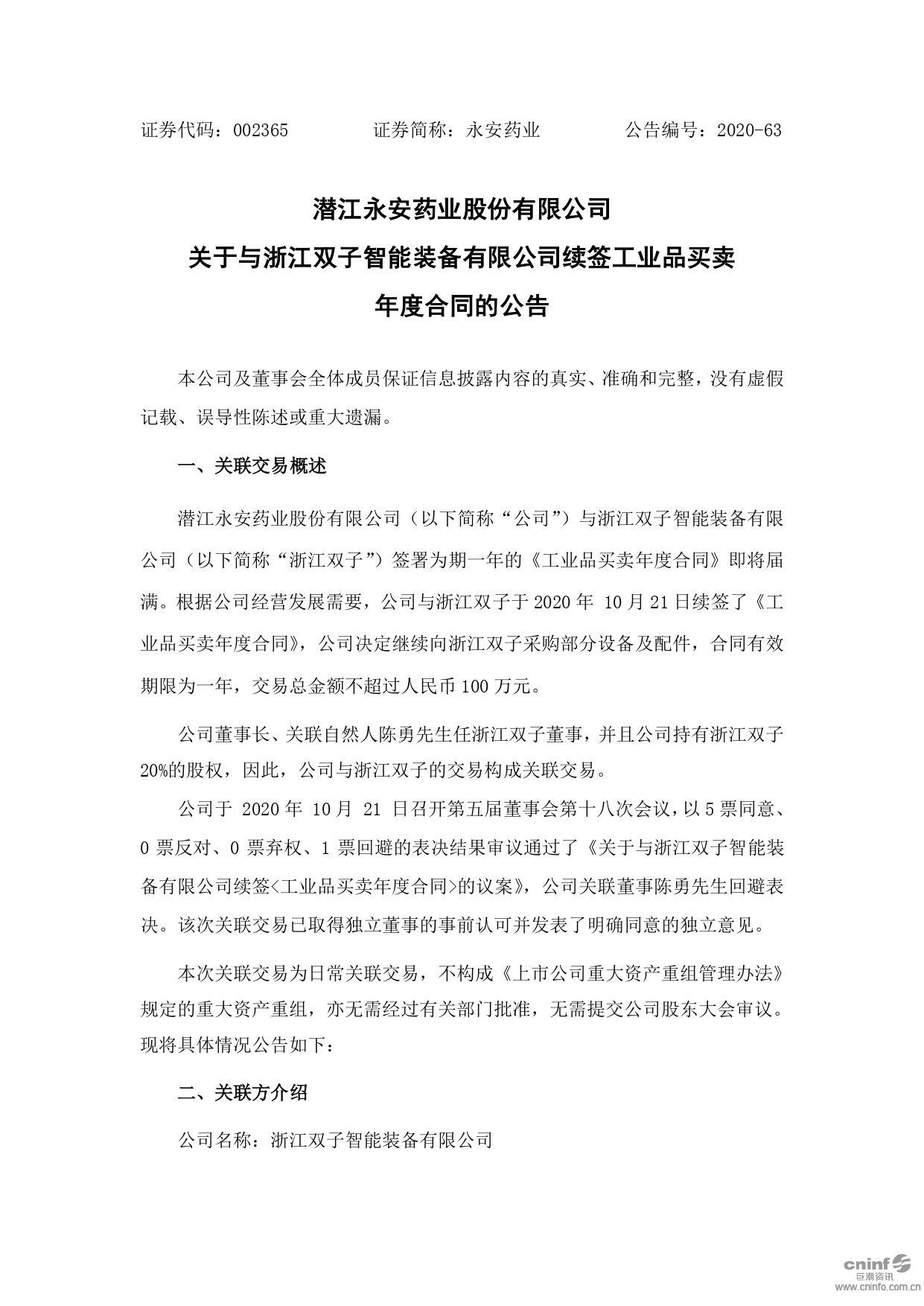 关于与浙江双子智能装备有限公司续签工业品买卖年度合同的公告