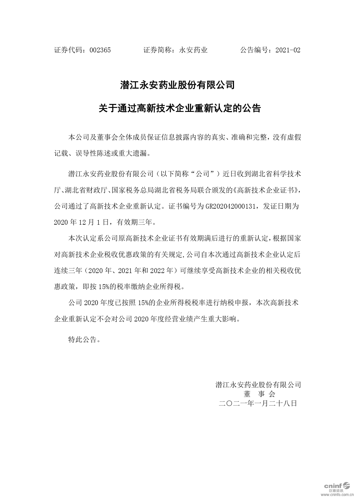 关于通过高新技术企业重新认定的公告